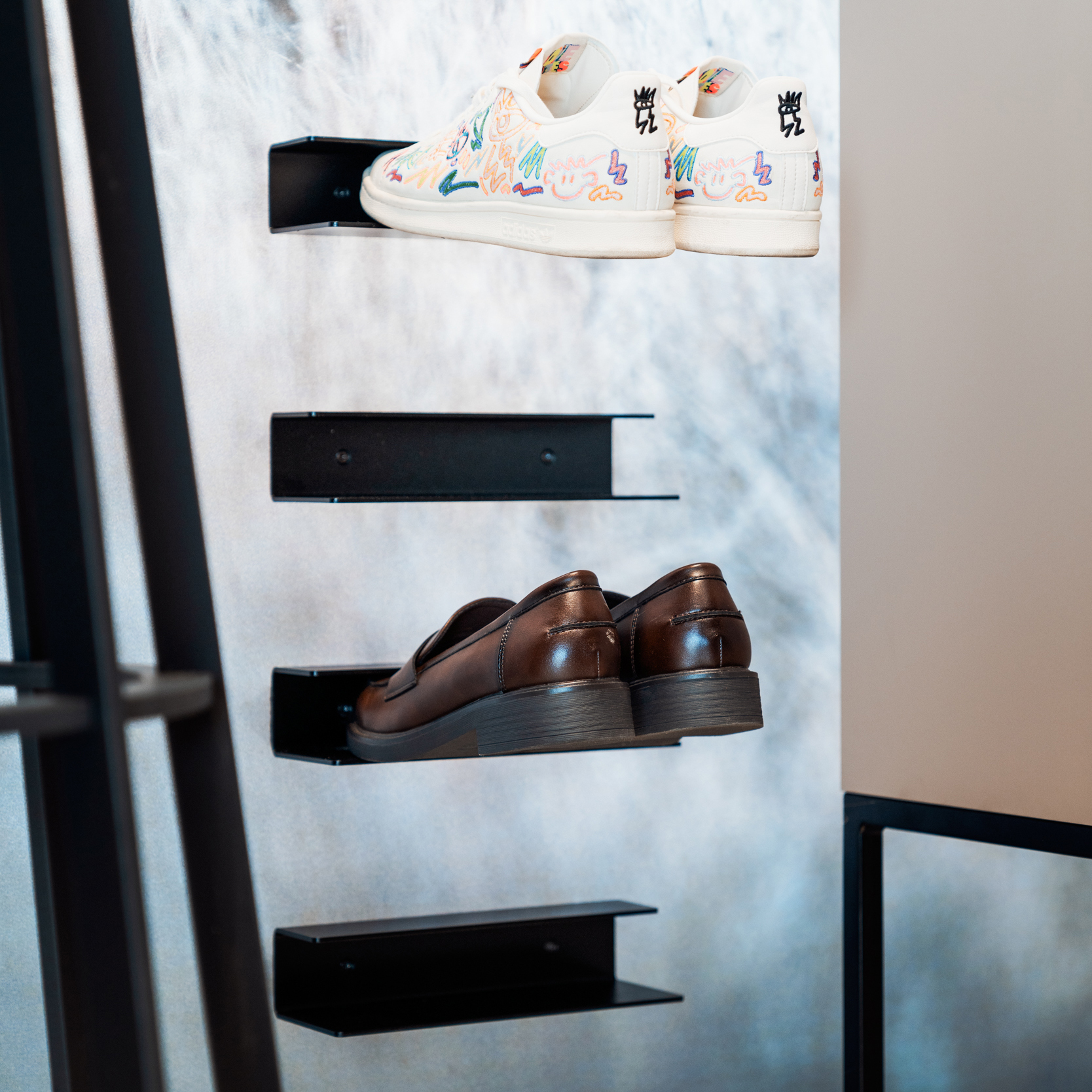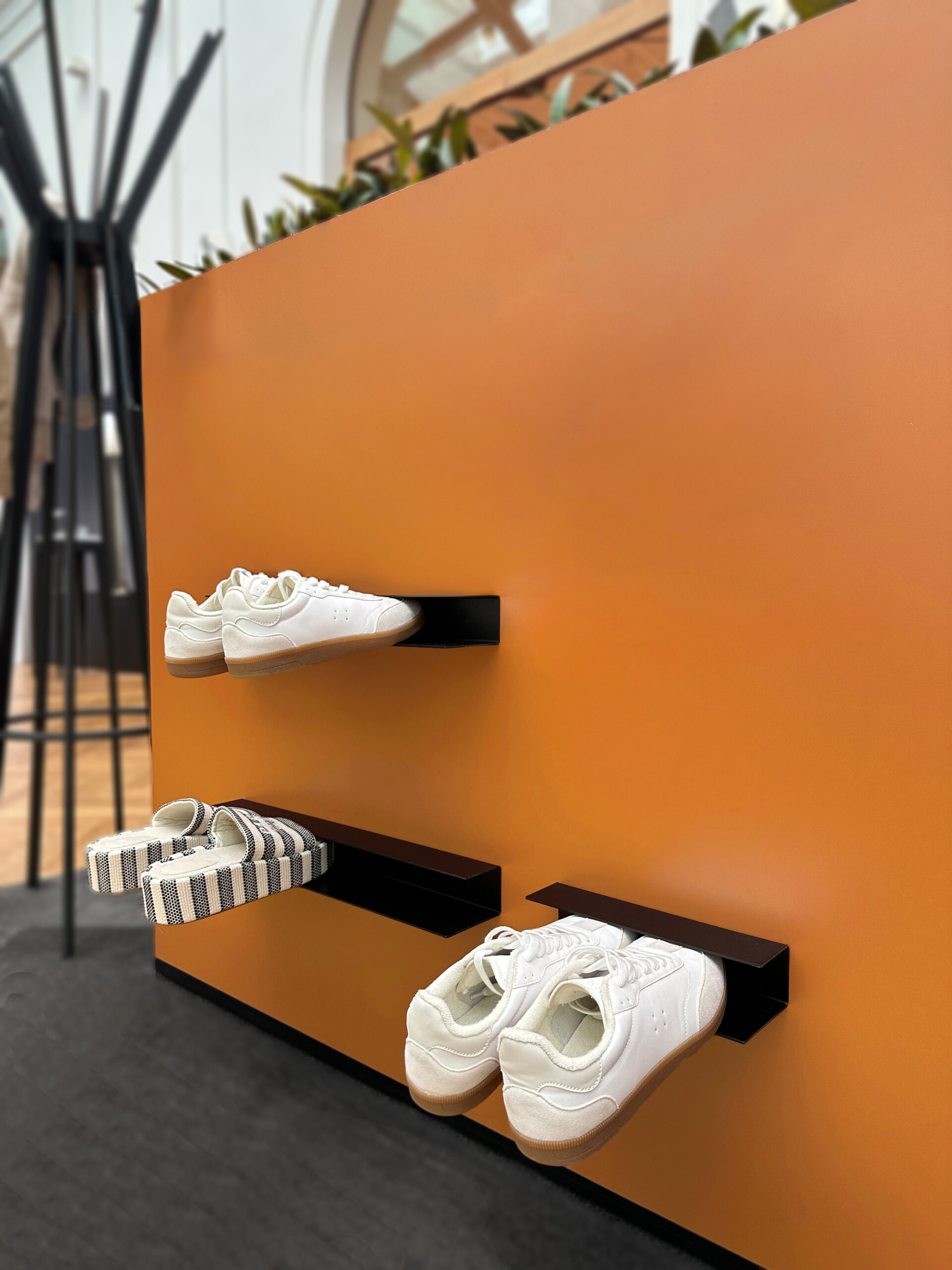 Die praktische Schuhablage aus Metall ist eine platzsparende und zugleich stilvolle Aufbewahrungslösung für deine Schuhe. Durch einfaches Einstecken der Schuhe in die stabile Halterung schaffst du Ordnung und setzt gleichzeitig ein ästhetisches Design-Statement in deinem Eingangsbereich.